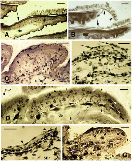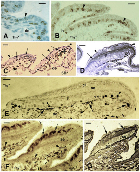 Histology of developing pad lamellae in Anolis lineatopus after tritiated thymidine autoradiography ((Thy*), (A,B,E,F)) or 5BrdU immunolabeling ((5Br), (C)). Toluidine blue and low-stained sections. Bars, 10 μm in all images. (A), initial formation of a lamella 4 h post-injection (arrowhead on labeled nuclei). (B), elongating lamellae 2 days post-injection (arrowheads on some labeled cells). (C), labeled nuclei in the basal (arrows) and periderm (arrowheads) at 4 days post-injection. (D), stained section showing the forming Oberhautchen (arrow) and the initial setae underneath the granular (clear) layer (arrowheads). (E), elongating lamellae with labeled cells (arrowheads) in the basal layer 2 days post-injection. Arrows indicate melanophores. (F), lamellae with developed setae 2 days post-injection of tritiated thymidine with labeled cells (arrowheads) visible in the basal layer (tangentially cut). Dashes outline the epidermis. Large granules (arrows) are present in the clear layer. (G), well-developed lamella (late embryo) evidencing the formation of the free margin (arrowhead) at the tip. Arrows indicate cells of the corneous clear layer. Dashes outline the epidermis. Legend: β, beta-layer/cells; cl, clear (granulated) layer; de, dermis; h, forming hinge (inter-scale) region; oβ, Oberhautchen-beta-layer; se, setae; t, lamella tip.