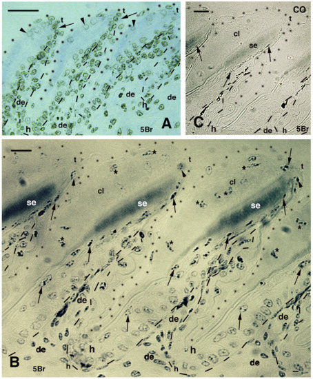 Immunolabeled pad lamellae of A. lineatopus at 8 days post-injection of 5BrdU (5Br). (A), early developing lamella with most labeled nuclei in the epidermis and dermis. Arrows indicate the relatively higher labeled nuclei by the tip of lamellae. Arrowheads point to labeled clear cell nuclei. Bar, 20 μm. (B), detail of labeled cells in the forming beta-layer (arrows pointing to flat nuclei). At the tip of the lamellae, labeled Oberhautchen cells are present (arrowheads). Asterisks indicate labeled nuclei of clear cells. Bar, 10 μm. (C), a control section does not show any labeled nuclei aside from finer grains of pigments (arrows). Bar, 10 μm. Legend: cl, clear layer; de, dermis; h, hinge (inter-scale) region; se, setae; t, tip (of the pad lamella). Dashes outline the epidermis. Dots outline most of the closely lined pad lamellae.