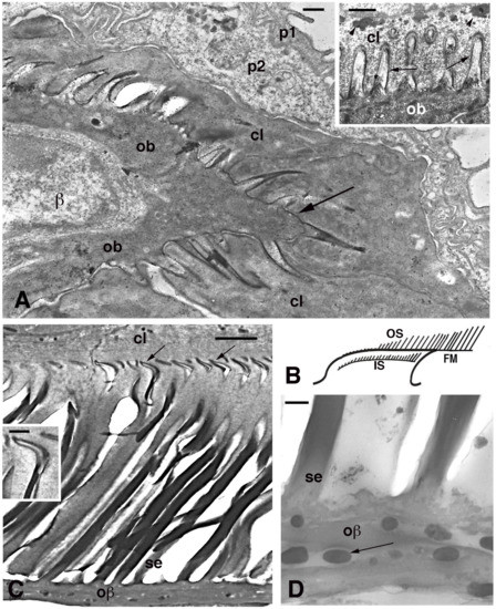 Electron microscopy of seta formation in late embryo of Anolis lineatopus (A) and adult of A. carolinensis (C,D). (A), tip of lamella with apical spinulae forming a rostrum that will produce the free margin (arrow) at a later stage. Bar, 0.5 μm. The inset (Bar, 0.5 μm) shows the initial formation of embryonic setae (arrows) penetrating the clear layer (arrowheads on keratohyalin-like granules). (B), schematic drawing illustrating the outer (OS) and inner (IS) setae generations of a mature lamella during the renewal phase. (C), detail on inner setae (refers to IS in (B)) that are almost mature with their terminal spatulae (arrows). Bar, 1 μm. The inset (Bar, 200 nm) shows the curved shape of the spatula. (D), detail on melanosomes (arrows) included within the Oberhautchen-beta-layer of the free margin (refers to FM in (B)). Bar, 0.5 μm. Legend: β, beta-cell (immature); cl, clear layer; IS, inner setae; ob, Oberhautchen cell; oβ, Oberhautchen merged with the beta-layer; OS, outer setae; p1, outer periderm; p2, inner periderm; se, setae.