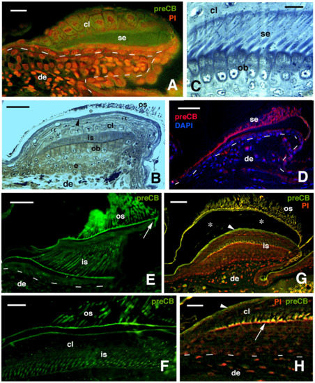 Immunofluorescence for CBPs (corneous beta proteins) using the pre-core box antibody (preCB) on pad lamellae of lizards. (A), pad lamella of late embryo of A. lineatopus with immunolabeled setae (green) and nuclei fluorescent (red) with propidium iodide (PI). Dashes underline the epidermis. Bar, 10 μm. (B), longitudinal and tangential section of lamella of H. turcicus showing numerous epidermal layers. The arrowhead indicates the alpha-layer. The asterisk indicates artifact separation (due to sectioning) between outer setae and the alpha-layer. Toluidine blue stain. Bar, 20 μm. (C), detail on the shedding complex of T. mauritanica with forming setae derived from Oberhautchen cells. Toluidine blue stain. Bar, 10 μm. (D), immunolabeled setae (red) and nuclei with DAPI (blue) in lamella of T. mauritanica. Dashes underline the epidermis. Bar, 20 μm. (E), immunolabeled (green) outer corneous layer and setae and inner corneous layer with its setae in H. turcicus. The arrow points to the immunofluorescent free margin. Bar, 20 μm. (F), immunolabeled setae and outer corneous layer with setae in T. mauritanica. Bar, 10 μm. (G), double labeling in outer and early-forming inner setae of T. mauritanica. The arrowhead indicates the alpha-layer and the asterisks the artifactual split of the epidermis under sectioning. Bar, 20 μm. (H), close-up view of inner setae (arrow) at an early phase of their growth. The arrowhead indicates the alpha-layer. Dashes underline the epidermis. Bar, 10 μm. Legend: α, alpha-layer; cl, clear layer; de, dermis; e, epidermis; is, inner setae; ob, Oberhautchen-beta-layer; os, outer setae; se, setae.
