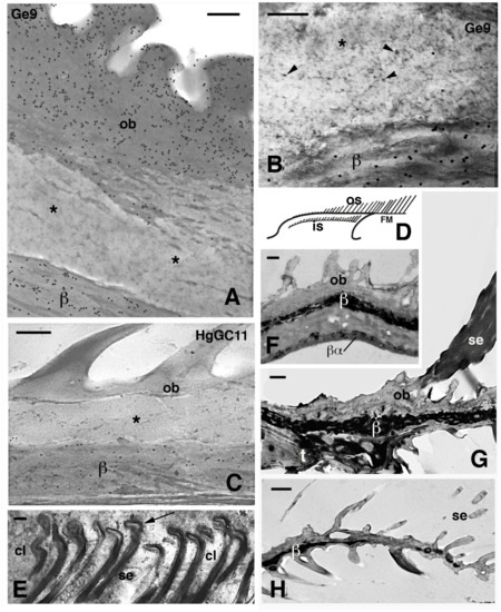 Electron microscopic details of external corneous layers of pad lamellae. (A), immunolabeled Oberhautchen and beta-layer in G. gecko using the Ge9 antibody for CBPs. Asterisks indicate a pale layer with scarce corneous material sandwiched between the labeled corneous layers. Bar, 200 nm. (B), detail of the pale layer (asterisk) containing sparse ribosomes (arrowheads). Ge9 immunolabeling in G. gecko. Bar, 100 nm. (C), detail of the corneous layer of lamella in H. turcicus with the pale layer (asterisk). Immunolabeling using the HgGC11 antibody for CBPs. Bar, 100 nm. (D), schematic drawing of lamella evidencing outer and inner setae. (E), forming spatula ends (arrows) of the inner setae in A. carolinensis. Bar, 200 nm. (F), detail of the corneous layer by the apex of the lamella in G. gecko. Bar, 0.5 μm. (G), detail of the corneous layer at the beginning of the free margin in G. gecko. Bar, 0.5 μm. (H), tip of the free margin in G. gecko. Bar, 0.5 μm. Legend: β, beta-layer/corneous material; βα, likely alpha-layer merged with the beta-layer of the lamella (mesos layer absent); cl, clear layer (cell); FM, free margin; is, inner setae; os, outer setae; ob, Oberhautchen; se, setae; t, distal tip of the pad lamella.