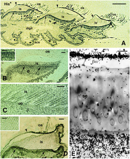 Autoradiographical view of pad lamellae and setae of H. turcicus 4 h post-injection of tritiated histidine (His*). (A), longitudinal section showing a digit with three pad lamellae (the ventral side is downward). The inner Oberhautchen-beta-layer (arrows) is intensely labeled, while the outer Oberhautchen-beta-layer is mainly labeled in the distal part (indicated by arrowheads). Bar, 100 μm. (B), intensely labeled epidermal area occupied by differentiating inner Oberhautchen and beta-cells (arrows). Bar, 10 μm. The inset (Bar, 5 μm) provides detail on the intense labeling of these layers. (C), detail of the diffuse autoradiographic labeling in inner setae and Oberhautchen layer in the renewal phase of the lamella epidermis. Bar, 10 μm. (D), labeling in the outer Oberhautchen-corneous layer (arrowhead) and inner Oberhautchen-beta-layer (arrows) at a late renewal phase of the epidermis, with inner setae only diffusely labeled. Bar, 10 μm. The inset (Bar, 0.5 μm) shows that the inner setae are almost unlabeled at this stage of the renewal phase. (E), electron microscopic autoradiography showing unlabeled inner setae, Oberhautchen-beta-layer and clear layer, while the differentiating inner alpha-cells underneath are heavily labeled. Moreover, numerous silver grains are present over the thin beta-alpha-layer forming the corneous layer sustaining the outer setae. Bar, 1 μm. Legend: β, forming beta-layer; βα, corneous layer formed by a thin beta-layer with the alpha-layer; cl, clear layer; dα, differentiating alpha-cells; e, epidermis; i, inner surface of the lamella; is, inner setae; ob, Oberhautchen-beta-layer; os, outer setae; sca, scales; se, setae (inner).