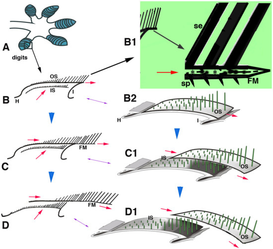 Schematic drawing summarizing the hypothesis of setae replacement in pad lamellae from phase (B–D) (blue arrowheads). (A), digit with lamellae (blue). (B), detail of a longitudinally sectioned lamellae with two setae generations. (B1), detail of the free margin (large arrow). Asterisks in B1 indicate the pale layer within the Oberhautchen and beta-layer that sustain the setae. (B2), three-dimensional representation of a lamella. (C), in a following phase, the outer setae move toward the lamella tip, while the inner setae grow underneath (red arrows). (C1) shows the distal displacement of the outer setae and the sustaining Oberhautchen-beta-layer. (D), in a final phase of shedding, the outer setae are lost from the lamella tip and the inner setae emerge underneath. (D1), three-dimensional view of outer setae shedding. Legend: FM, free margin; H, hinge region; I, inner lamella surface; IS, inner setae; OS, outer setae; se, setae; sp, spinulae; The red arrows indicate the upper and distal movements of outer and inner setae.