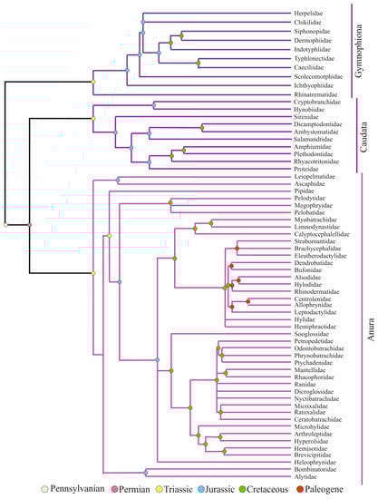 - Cannatella, D.C.; Vieites, D.R.; Zhang, P.; Wake, M.H.; Wake, D.B. Amphibians (Lissamphibia). In The Timetree of Life; Hedges, S.B., Kumar, S., Eds.; Oxford University Press: Oxford, UK, 2009; pp. 354–356. [Google Scholar]