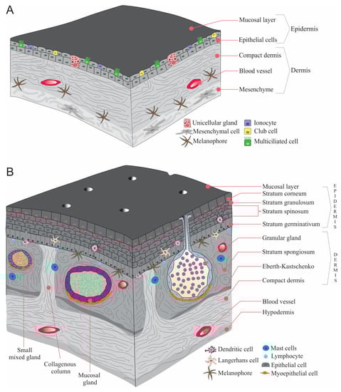 A general illustration of amphibian skin. (A). larvae, (B). Adult ((B) is adapted with permission from Ref. [23]. 2022, Akat et al.).