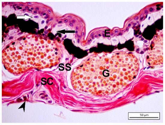 Xanthophores are found mostly in the chromatophore unit in the dermis. This chromophore type includes pteridine pigments, which provide yellow, orange, or red coloration. Iridophores (guanophores) that lie below xanthophores are reflective cells consisting of platelets that contain purine pigment as iridescent material [9,43]. Although some melanophores have an epidermal localization, most of them are situated in the dermis (Figure 4A,D).