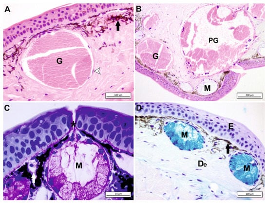 (A) The dorsal skin of Salamandra infraimmaculata, granular gland (G), melanophore (black arrow). The periphery of dermal gland was surrounded with a monolayer of myoepithelial cells (arrowhead), Gill’s H&E staining. (B) Mucous gland (M), granular gland (G), parotoid gland (PG), H&E staining. (C) In the dorsal skin of S. infraimmaculata, each gland discharges secretion by epidermal duct (*), mucous gland (M), blood vessel (white arrow) PAS staining. (D) The ventral skin of S. infraimmaculata, epidermis (E), dermis (De), mucous gland (M), melanophore (black arrow) AB staining.