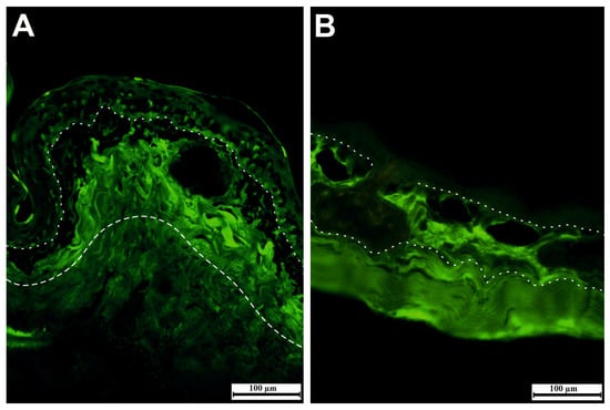The dermis of terrestrially spread adult amphibians is divided into spongious and compact dermis (Figure 3) through the presence of the Eberth–Katschenko layer. This noncellular layer completely consists of glycosaminoglycans and glycoconjugates in which hyaluronic acid and dermatan sulfate are key components in various species. Hyaluronic acid and other hyaluronic acid-like molecules in the Eberth–Katschenko layer are mainly present in the dorsal side of amphibian skin [38]. HA is a high-molecular-weight glycosaminoglycan that has prominent biological functions from bacteria to high vertebrates including humans. The HA has an ability to bind large volumes of water, and this feature makes it a perfect lubricator and water absorber. It has been reported [64] that the HA is one of the most hydrophilic molecules in nature, and it has been defined as nature’s moisturizer. Water-retentive hyaluronic acid helps to decrease water vaporization, thus assisting to prevent desiccation, especially in basking amphibians [70,71]. HA immunoreactivity is mainly observed in the dermis, and it was mainly distributed in the upper region of dermis in Salamandra infraimmaculata and Hyla savignyi (Figure 5A,B). Biotinylated hyaluronic acid binding protein (B-HABP) was used to assess the immunoreactivity of HA. Blocking was performed with 2% bovine serum albumin, and visualization was done with streptavidin-fluorescein isothiocyanate (FITC). For the negative control, hyaluronidase-digested sections were used. The specificity of the staining was controlled by digesting some sections with Streptomyces hyaluronidase prior to the incubation with the probe. For the positive control, sections were stained with B-HABP/HA. Based on the former findings mentioned, HA has probably functioned as a water barrier, which provides the transportation of water to the epidermis to maintain skin moisture and decrease the level of mechanical stresses.