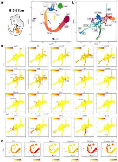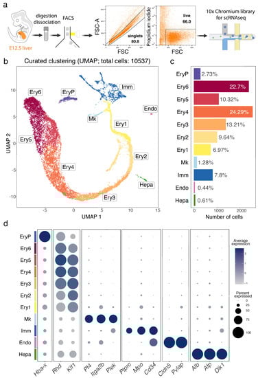To define the cellular landscape of early liver haematopoiesis in the context of other developing liver cell lineages, we generated a scRNA-seq dataset of the mouse E12.5 liver using a droplet-based approach that allowed recovery of a hundred times higher number of cells compared to a previous report, which only sequenced ~100 cells at this stage []. Thus, two independent single cell cDNA libraries were prepared from the total single cell suspension of E12.5 foetal liver and sequenced in two batches that were pooled to increase the number of cells sequenced (Figure 1a, Figures S1 and S2a). The data from 10,537 cells passed quality control and underwent graph-based unsupervised Louvain clustering and dimensionality reduction by Uniform Manifold Approximation and Projection (UMAP) (Figure S2b). Differentially expressed genes (DEGs, Figure S2c) were used to annotate cell clusters and to pool the most similar clusters into a curated representation of E12.5 liver cell populations (Figure 1b–d). These DEGs are listed in detail in the sections below, where we will discuss specific cell populations. Overall, we identified 11 major cell populations (Figure 1b,c). The identity of each cluster was assigned by matching the cluster expression profile to established cell type-specific genes for erythroid cells (e.g., Hba-x for EryP, Rhd and Klf1 for Ery1-6), megakaryocytes (Mk, e.g., Pf4, Itga2b and Plek), immune cells (Imm, e.g., Ptprc and Mpo), endothelial cells (Endo, e.g., Cldn5 and Sox18) and hepatocytes (Hepa, e.g., Alb, Alf and Dlk1) (Figure 1d). As expected, given the red colour appearance of the foetal liver, ~90% of all E12.5 liver cells were erythroid cells (Figure 1c). The Imm, Mk and Ery1-6 clusters formed a single, branched supercluster when UMAP dimensional reduction was applied (Figure 1b), suggesting that these cell types can share a common haematopoietic progenitor lineage from the immune cell cluster. Instead, hepatocytes and endothelial cells formed segregated clusters from each other and the immune cell cluster, consistent with distinct lineage origins.
