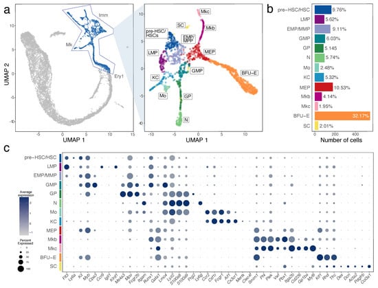 Haematopoietic cell identification in E12.5 mouse liver by scRNA-seq analysis. (a) Subset selection followed by UMAP plot visualisation identifies subclusters of distinct haematopoietic cell types. (b) A histogram shows the percentage and total number of cells in each subcluster. (c) A bubble plot shows expression of selected marker genes in each subcluster; the dot size in represents the percentage of cells within a cell cluster in which a marker was detected, and the dot colour intensity represents the average expression level of that marker. Abbreviations: BFU-E, erythroid burst forming unit; EMP, erythro-myeloid progenitor; GMP, granulocyte-monocyte progenitor; GP, granulocyte progenitor; HSC, haematopoietic stem cell; KC, Kupffer cell; LMP, lympho-myeloid progenitor; MEP, megakaryocyte-erythroid progenitor; Mkb, megakaryoblast; Mkc, megakaryocyte; MMP, multipotent progenitor; Mo, monocyte; N, neutrophil; SC, stellate cell.