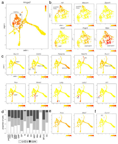 The CellCycleScoring prediction algorithm in Seurat together with expression analysis for the S marker Pcna [] and S/G2 marker Mki67 [] reported that cell number expansion mainly occurs in MEPs as well as downstream of MEPs in the megakaryoblasts and BFU-E of the megakaryocyte/erythroid branch as well as in granulocyte progenitors of the myeloid branch (Figure 3d,e). Cell number expansion was more moderate in HSPCs at E12.5, with pre-HSCs/HSCs appearing less proliferative than other progenitors at this stage (Figure 3d,e). Liver megakaryocytes appeared to have already terminally differentiated at E12.5, because this cluster lacked cells entering the G2/M phase, with less than 10% of cells in this cluster in the S phase (Figure 3d,e). Within the myeloid lineage, neutrophils also appeared already terminally differentiated, whereas the majority of Kupffer cells and especially monocytes were either in the S or G2/M phase (Figure 3d,e).