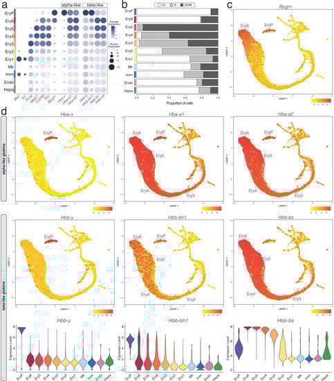 In the E12.5 liver, transcripts for the embryonic α-like globin Hba-x (ζ) and β-like globin Hbb-y (εy) were restricted to the EryP cluster, which also expressed the α globins Hba-a1 and Hba-a2 (α) as well as the β-like globin Hbb-bh1 (βH1), but low levels of adult β globins Hbb-bs and Hbb-bt (Figure 4a,d; note that Hbb-bs and Hbb-bt are specifically present in C57BL/6 mice, whereas BALB/c and 129Sv mice have a different haplotype that includes Hbb-b1 and Hbb-b2). To corroborate that the EryP cluster represents primitive erythrocytes, we also analysed scRNA-seq data from whole embryos with yolk sacs at E8.5 (ArrayExpress, E-MTAB-6967) [], when primitive erythrocytes arise in the yolk sac []. EryP at E8.5 were identified by Klf1 and Rhd (Figure S4a,b) and were nucleated (Malat1-positive; Figure S4c). Similar to E12.5, EryP at E8.5 had high levels of Hba-x and the Hba-a1 and Hba-a2 (α) as well as Hbb-y and Hbb-bh1 (βH1), but barely detectable levels of adult β globin Hbb-bs and Hbb-bt (Figure S4d). By contrast to EryP cells at E12.5, however, EryP at E8.5 still expressed low transcript levels for the mature erythrocyte marker Bpgm (Figure S4d). The adult β globin transcripts Hbb-bs and Hbb-bt were highly expressed in the erythroid clusters Ery3, Ery4, Ery5, Ery6 of E12.5 liver alongside the α globins Hba-a1 and Hba-a2, (Figure 4a,d). These clusters also retained Hbb-bh1 expression, although at lower levels than in primitive erythrocytes (EryP) (Figure 4a,d). Foetal liver erythropoiesis can therefore be distinguished from primitive erythrocytes by the expression of both adult β globin genes and the embryonic β-like globin Hbb-bh1.