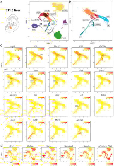 scRNA-seq of the E11.0 mouse liver. (a,b) The UMAP plot in (a) visualises clusters of distinct cell types in the total dataset; the box indicates the Mk, BFU-E and Imm clusters, which were subclustered in (b). (c,d) UMAP plots visualise expression of the indicated genes that serve as markers of distinct branches of haematopoietic cell (c) and erythroid differentiation (d). In (c,d), each UMAP plot names the cluster(s) expressing the indicated gene. EC, endothelial cells; li. EryP, liver primitive erythrocytes; Mkb, megakaryoblasts; NA, not assigned; STC/SC, septum transversum cells/hepatic stellate cells.