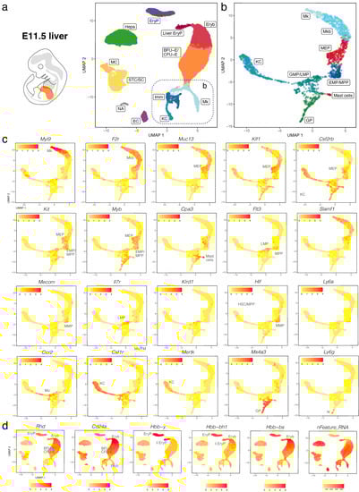 scRNA-seq of the E11.5 mouse liver. (a,b) The UMAP plot in (a) visualises clusters of distinct cell types in the total dataset; the box indicates the Mk, KC and Imm clusters, which were subclustered in (b). (c,d) UMAP plots visualise expression of the indicated genes that serve as markers of distinct branches of haematopoietic cell (c) and erythroid differentiation (d). In (c,d),each UMAP plot names the cluster(s) expressing the indicated gene; MC, mesothelial cells.