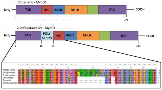Inclusion of a polyserine insertion in MyoD1 in some fish species. Comparison of the protein structure of MyoD1 from Danio rerio (above) and Oreochromis (Alcolapia) alcalica (below). The enlargement of the schematic shows an alignment of the amino acid sequences from the indicated part of MyoD1 proteins from Oreochromis (Alcolapia) alcalica, Takifugu ruberipes, Poecilia formosa, Cyprinus carpio, Danio rerio, Oncorhynchus mykiss including the polyserine insertion in some species. Multiple species alignment of MyoD1 with and without the polyserine insertion. * represents exact match and: represents residues where the majority of species show conservation.