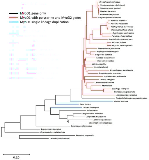 The teleost phylogeny published by Hughes et al. [] was used to investigate the evolution of the different MyoD genes in these fish species (Figure 2). Comparison of this tree with the sequence data for MyoD1 and MyoD2 in teleost fish revealed clades where the polyserine insertion in MyoD1 had occurred and identified which clades had both a MyoD1 and MyoD2 gene. This analysis indicates that the inclusion of a polyserine insertion in MyoD1 is found in species that retain a MyoD2 gene (Figure 2, red lines). This suggests that the polyserine insertion arose as a single evolutionary event and was incorporated and retained by species in this lineage. It has been well described that some fish species (which have neither a polyserine insertion in their MyoD1 nor a MyoD2 gene), such as salmon and cod [,,], have multiple MyoD1 genes arising from single lineage duplication events (Figure 2, blue lines).