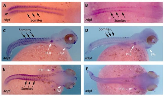 Expression analysis of MyoD1 and MyoD2 in the developing embryos of Oreochromis (Alcolapia) alcalica. (A,C,E) Lateral and dorsal views of O. alcalica embryos analysed by in situ hybridisation for MyoD1 and (B,D,F) for MyoD2. The number of days post fertilisation [dpf] is indicated for each image. Arrows show somites, white arrowheads indicate facial muscle (FM) and white arrows indicate developing pectoral fin bud (PFB). Black dots around the yolk and on the body are chromatophores (pigment cells).