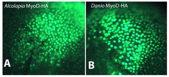 MyoD is an important developmental switch that determines cell fate by driving skeletal muscle cell differentiation. MyoD is part of a family of myogenic regulatory genes coding for basic helix-loop-helix (bHLH) transcription factors that activate skeletal muscle specific gene expression during development and muscle regeneration [,,]. MyoD is highly conserved, with orthologous genes across all vertebrates as well as related regulators in invertebrates [,]. One copy of the MyoD gene is present in the birds and mammals that have been investigated, and the two MyoD alleles reported in allotetraploid Xenopus laevis represent its homoeologous subgenomes [], while only one copy is present in the diploid Xenopus tropicalis []. In contrast to terrestrial vertebrates, many fish species have more than one MyoD gene [,].