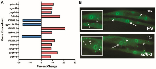 Figure 1. RNAi of genes differentially regulated in adr-2 mutants alter protein misfolding. (A) Isogenic worm strain expressing α-syn::GFP in the body wall muscle cells of C. elegans were fed E. coli expressing candidate gene RNAi constructs and scored for aggregate size and number, which were combined to generate an overall aggregate score. Synchronized worms were analyzed two days post hatch, and a percent change for each gene was calculated in comparison to empty vector control. The top 14 genes that resulted in the greatest cumulative percent change in aggregation are represented. (B) RNAi of xdh-1 (bottom) in worms expressing α-syn::GFP in the body wall muscles under control of the Punc-54 promoter showed increased aggregate size and number in comparison to empty vector control (top). Images were taken at 10× and modified to best display the entire body wall muscle cell and their features. Examples of scoring criteria: A = small aggregate, B = medium aggregate, C = large aggregate, arrow = nuclei of body wall muscle cell, arrowhead = representative aggregates.