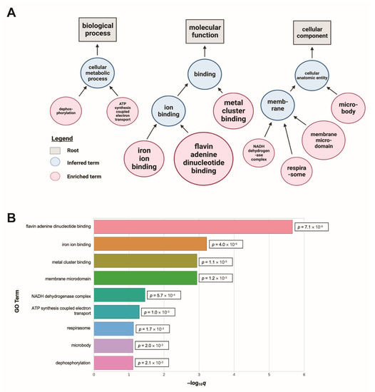 To functionally analyze the fourteen identified candidates, a gene enrichment analysis was performed to identify highly associated biological pathways, molecular mechanisms, and phenotypes (Figure 2A). Of these, the two most significant terms were flavin adenine dinucleotide (FAD) binding and iron ion binding (Figure 2B)—four genes were affiliated with FAD binding, and three were connected to iron binding.