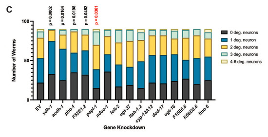 Other significant processes connected to these candidates include function of the NADH dehydrogenase complex, ATP synthesis-coupled electron transport, and respirasome activity—all affiliated with the electron transport chain (Figure 2A). Since these genes are so strongly correlated with PD pathologies and altered protein-misfolding of α-syn, it was hypothesized that they likely represent functional effectors of dopaminergic neurodegeneration. To determine the impact of the candidate genes on dopaminergic neuronal death, RNAi of each candidate gene was performed in a RNAi-sensitive worm strain in which knockdown is delimited to only the dopamine neurons—these worms also overexpress WT human α-syn and GFP, independently, both under the control of the dopamine transporter (Pdat-1) promoter and which allow for age- and dose-dependent analysis of neurodegeneration [34]. Following treatment, the four cephalic (CEP) and two anterior deirid (ADE) dopaminergic neurons of all worms in each population were analyzed via fluorescent microscopy, and individual worms were subsequently categorized as having zero degenerated neurons, one degenerated neuron, two degenerated neurons, three degenerated neurons, or four to six degenerated neurons. This experimental paradigm facilitated the examination of the neuronal health of the entire population of worms in each group (Figure 2C). Of the candidates, one gene, papl-1, enhanced neurodegeneration, while four, xdh-1, acdh-1, pho-1, and F52E1.2, were protective when knocked down (Table 3). RNAi targeting of xdh-1, pho-1, or F52E1.2 resulted in an increase in animals with six wildtype anterior dopamine neurons, suggesting that reduced expression of these genes supports dopaminergic neuronal health. RNAi of acdh-1 did not lead to more animals having zero degenerated neurons (wild-type); however, more individuals in this group displayed one degenerated neuron in comparison to the EV control. Because RNAi only leads to reduced gene expression, these data indicate that complete knockout of acdh-1 may be neuroprotective against α-syn-induced neurodegeneration.