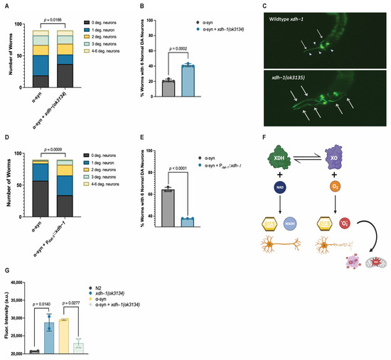 Figure 3. XDH-1 modulates neuroprotection by impacting ROS production. (A,B) Animals with wildtype or mutant xdh-1 were crossed to isogenic worms expressing α-syn + GFP in dopamine neurons. The four CEP and two ADE dopaminergic neurons were analyzed for the presence or absence of intact cell bodies and axonal processes in synchronized worms seven days post hatch (three independent experiments, n = 30 per independent groups). Worms with the xdh-1(ok3134) mutation exhibit neuroprotection against α-syn. (A) The number of degenerated neurons in each individual worm of the total population. Chi-square analysis was performed where α-syn + xdh-1(ok3134) was compared to α-syn alone and values are represented by exact p values (three independent experiments, n = 30 per independent groups; N = 3; n = 30). (B) The percentage of worms with six normal dopaminergic neurons. Student’s t-test, where α-syn + xdh-1(ok3134) was compared to α-syn alone, and values are represented by exact p values (three independent experiments, n = 30 per independent groups; N = 3; n = 30). (C) C. elegans expressing α-syn + GFP in dopaminergic neurons, wildtype, and mutant for xdh-1. Arrows represent wildtype dopamine neurons with a cell body and intact axonal process, and arrowheads represent degenerated dopamine neurons. The xdh-1 mutation confers protection against α-syn induced neurodegeneration. (D,E) Worms overexpressing xdh-1 under control of the Pdat-1 promoter were crossed with worms expressing α-syn + GFP in dopaminergic neurons. Subsequently, animals were synchronized and scored for neurodegeneration four days post hatch. This time point was chosen because worms expressing α-syn + GFP in dopaminergic neurons exhibit time-dependent neurodegeneration, and we have observed that enhanced neurodegeneration is more readily detected in younger adult worms. Worms with increased xdh-1 expression in dopaminergic neurons showed decreased neuroprotection in four-day old worms. (D) The number of degenerated neurons in each individual worm of the total population. Chi square analysis was performed, where α-syn + Pdat-1::xdh-1 was compared to α-syn alone, and values are represented by exact p values (three independent experiments, n = 30 per independent groups; N = 3; n = 30). (E) The percentage of worms with six normal dopaminergic neurons. Student’s t-test where α-syn + Pdat-1::xdh-1 was compared to α-syn alone and values are represented by exact p values (three independent experiments, n = 30 per independent groups; N = 3; n = 30). (F) In the purine catabolic pathway, xanthine dehydrogenase (XDH) and xanthine oxidase (XO) catalyze hypoxanthine to xanthine and xanthine to uric acid. XDH and XO are interconvertible and are encoded by a single gene. For XDH activity, NAD is required as a cofactor, and NADH and uric acid are produced. In contrast, molecular oxygen is needed for XO to function, and uric acid and superoxide anions result. Reactive oxygen species (ROS) contribute to mitochondrial dysfunction, oxidative stress, and ultimately cell death. Created with Biorender.com. (G) Wildtype N2 worms, xdh-1(ok3134) mutant animals, and transgenic worms expressing α-syn in dopaminergic neurons with and without the xdh-1(ok3134) mutant, were treated with a specialized fluorescein to quantify ROS in the sample. Three biological replicates and two technical replicates were completed for all worm strains. After 2.5 h, worms expressing α-syn and GFP in dopaminergic neurons that are mutant for xdh-1 produce lower ROS than worms without the mutation. Significance was obtained using a One-way ANOVA with a Tukey’s post hoc test and are represented by exact p values (N = 3; n = 30).