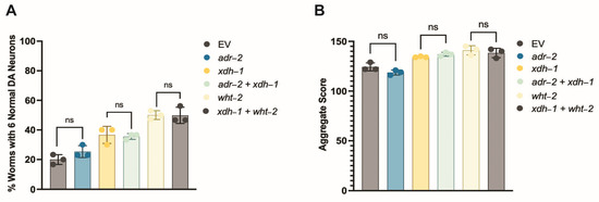 Figure 4. xdh-1, wht-2, and adr-2 comprise a genetic regulatory network that affects PD pathologies in a tissue-specific manner. (A) Synchronized worms were scored for dopamine neurodegeneration seven days post hatch. Knockdown of xdh-1 and xdh-1 + ad--2 indicate that ADR-2 does not impact XDH-1 activity, while knockdown of wht-2 + xdh-1 indicates that XDH-1 does not regulate WHT-2 activity. These experiments were completed via RNAi knockdown in dopaminergic neurons of C. elegans, expressing α-syn and GFP, separately, under control of the Pdat-1 promoter (three independent experiments, n = 30 per independent groups; N = 3; n = 30). EV = empty vector control. Significance was obtained using a one-way ANOVA with a Tukey’s post hoc test; ns > 0.05. (B) The same experimental paradigm was performed in worms expressing an α-syn::GFP fusion protein in the body wall muscles. Synchronized two-day old worms were scored for aggregate size and number, which were combined to generate an overall aggregate score. The relation between adr-2, xdh-1, and wht-2 in the body wall match that shown in dopaminergic neurons, implying that wht-2 is the rate-limiting member of this system (three independent experiments, n = 30 per independent groups; N = 3; n = 30). EV = empty vector control. A One-way ANOVA with a Tukey’s post hoc analysis was employed, ns > 0.05.