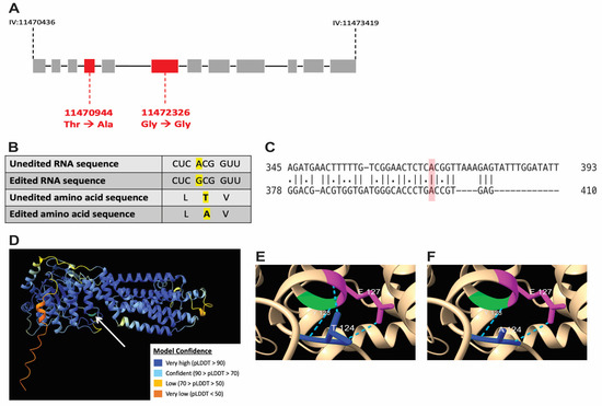 Figure 5. RNA editing of wht-2 leads to a non-synonymous amino acid substitution that is predicted to alter protein folding. (A) Editing sites in the wht-2 gene. wht-2 consists of 12 exons located at genomic position IV: 11470436 to IV: 11473419 in the C. elegans genome. Two bases in the coding mRNA are edited, with one resulting in an amino acid substitution upon translation. (B) Comparison of the site (highlighted in yellow) of the wht-2 RNA and amino acid sequences, respectively, in the presence and absence of editing at IV: 11470944. (C) Pairwise alignment between C. elegans wht-2 (top) and human ABCG2 (bottom) DNA sequences. The identified editing site, IV: 11470944 in the C. elegans genome, highlighted in red, is located in a region conserved between the C. elegans and human genomes. (D) The complete structure of the unedited WHT-2 protein. The arrow indicates residue 124 where threonine is switched to alanine when RNA is edited, outlined in green. The key indicates AlphaFold model prediction confidence. (E,F) Changes in protein structure at residue 124 when WHT-2 is not edited (D) vs. edited (E). Hydrogen bonding (shown in green) and protein folding are altered because of editing. The three amino acids in the region are represented by magenta (E, glutamic acid), green (Y, tyrosine), and dark blue (T, threonine in (E) or A, alanine in (F)).