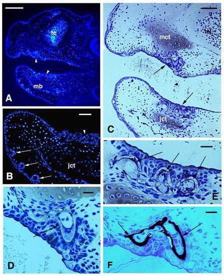 DAPI immunofluorescence (A,B) and histology (C–F, toluidine blue stain) of the skin and oral epithelium of the head in a 2.5 cm long larva. (A) head featuring a thin epidermis and thicker oral epithelium (arrowheads). Bar, 100 μm. (B) Close up to the tip of the jaw showing the invaginating teeth epithelium (arrowhead) and forming epithelial ampullae (sensory organs). Bar, 20 μm. (C) particular of the forming teeth (arrows) in the maxilla and jaw. Bar, 50 μm. (D) Close up on a pointed tooth (arrow) with mineralized layer (enamel). Bar, 10 μm. (E) three forming and mineralized teeth (arrows) in the jaw. Bar, 10 μm. (F) Dark precipitate of calcium (arrows) in the mineralized layer of two teeth in the maxilla. Bar, 10 m. Legends: jct, cartilage of the jaw (Mekel); mb, mandible (jaw); mct, cartilage of the maxilla (palatoquadrate); te, telencephalon.