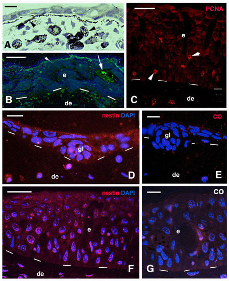 Histology (A) and immunofluorescence (B–G) of small and larger juvenile skin. (A) Thin epidermis with accumulating melanophores (arrowheads) in the dermis. Bar, 10 μm. (B) Small juvenile skin with external mucin immunoreactivity (arrowhead) and a mucous cell (arrow). Mucin-reactive dots are also seen along the basement membrane, suggesting presence of mucine-like glycoproteins. Bar, 10 μm Bar, 10 μm. (C) Thick epidermis of large juvenile containing PCNA-labeled nuclei (arrowheads). Bar, 20 μm. (D) diffuse nestine immunofluorescence in keratinocytes of small fish epidermis. Bar, 10 μm. (E) Immunonegative section. Bar, 10 μm. (F) Weak nestin immunofluorescence in thick epidermis of larger juvenile fish. Bar, 20 μm. (G) Negative control section of larger juvenile epidermis. Bar, 10 μm. Legends: de, dermis; e, epidermis; gl, likely forming gland. Dashes underline the epidermis.