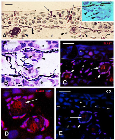 Histology (A,B) and immunolabeling (C–E) of the skin in N. forsteri specimen 5 cm long. (A) Cross-section of multistratified tail epidermis showing sparse mucous- secreting cells (arrows) using toluidine blue stain. Arrowheads indicate cells surrounding “circular bodies” located beneath the basement membrane, bordered by the cytoplasmic elongation of pigment cells (double arrowhead). Bar, 20 μm. The inset (bar, 10 μm) shows the numerous fibroblasts (osteoblasts, arrowheads) surrounding the amorphous material and the central, pale region (arrow). (B) Close up on two “circular bodies” after PAS-methylene blue staining. The central region of the bodies is blue (arrow) while fibroblasts (arrowheads) surround a weakly pink (PAS-positive) fibrous material. Bar, 10 μm. (C) Dermal fibroblasts (arrowheads) surrounding circular bodies containing a central region immunoreactive for elastin (arrow). Bar, 20 μm. (D) Higher magnification of two circular bodies with central elastin immunostaining (arrow). Bar, 10 μm. (E) immunonegative control (arrow). Bar, 20 μm. Legends: d, dermis; e, epidermis. Dashes underline the epidermis.