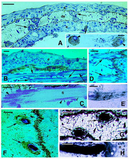 Histology (toluidine blue) and von Kossa histochemistry (dark) of the tail skin in a 5 cm long larva. (A) Cross section showing the two sides of the epidermis with the “circular bodies” (lepidotrichia) located underneath. Bar, 20 μm. The inset (bar, 10 μm) shows a dark granulation derived from the von Kossa reaction for calcium. The central cores (arrowheads) are uncalcified. (B) Longitudinal section showing two lepidotrichia associated with numerous osteoblasts (arrows) underneath the epidermis. Bar, 10 μm. (C) Detail of a lepidotrichium with osteoblasts (arrowheads) surrounding the pale fibrous region (fi). Bar, 10 μm. (D) two terminal lepidotriches tips (arrows) contacting the epidermis. Bar, 10 μm. (E) longitudinal section of weakly mineralized (dark areas) lepidotrichium. Bar, 10 μm. (F) Two tips of weakly mineralized lepidotriches (arrows) terminating on the epidermis. Bar, 10 μm. (G) two heavily calcified lepidotriches (arrows) in cross section (roundish bodied). Bar, 10 μm. (H) A longitudinal section of a heavily calcified lepidotrichium. Bar, 10 μm. Legends: de, dermis; e, epidermis; fi, fibrous component of the lepidotrichia.