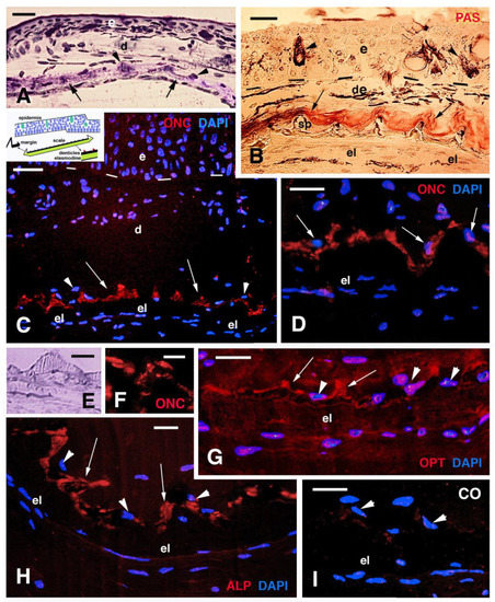 Histological sections of the skin of 5 cm long specimen (A) and of juveniles’ (B–I) skin. (A) Histological section showing a thin epidermis, loose dermis, spinulae (arrowheads), and the underlying thin fibrous layer (elasmodin, arrows) of the scale. Toluidine blue stain. Bar, 20 μm. (B) PAS-stained section showing intensely reactive mucus cells (arrowheads) and numerous melanophores in the dermis. The spinulae of the outer layer (squamulina) are surrounded by PAS-positive material (arrows). Bar, 20 μm. (C) Spinulated layer (denticles, arrows) immunolabeled for osteonectin (ONC). Arrowheads indicate cells associated to the denticles. The indicative position of dermal scales is shown in the associated drawing. Bar, 20 μm. (D) Detail of bony denticles immunolabeled for osteonectin and the associated cells (arrows indicating the nuclei). Bar, 10 μm. (E) detail on one bony denticle. Toluidine blue stain. Bar, 5 μm. (F) immunolabeled denticle for osteonectin (only TRITC immunofluorescence). Bar, 5 μm. (G) Osteopontin (OPT) labeling of denticles (arrows). A weaker immunofluorescence is also seen in the surrounding connective tissue and in the elasmodin layer of the scale. Arrowheads indicate cells associated to the denticles. Bar, 10 mm. (H) Immunolabeling of the spinulated layer (arrows) for alkaline phosphatase (ALP). Arrowheads indicate the nuclei of associated cells. Bar, 10 μm. (I) immunonegative control section (CO) with nuclei of the cells (arrowheads) associated to the spinulae. Bar, 10 μm. Legends: de, dermis; e, epidermis; el, elasmodin (layer); sp, spinulae or denticles (squamulin).