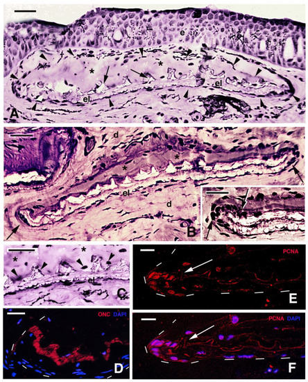 Histology (A–C) and immunofluorescence (D,F) of juvenile skin. (A) juvenile of 16 cm featuring an entire scale (arrows) located underneath the epidermis. Arrows indicate the outer or limiting layer formed by bony spinulae. Asterisks indicate a pocket-like area (arrowheads) occupied by loose dermal connective tissue. Bar, 20 μm. (B) Elasmoid scale with its definitive tilted disposition in the dermis. Asterisks indicate the loose dermal pocket associated with the spinulated bony surface. The arrows indicate the marginal regions (anterior, right, and posterior on the left) of the scale. Bar, 30 μm. The inset (bar, 20 μm) shows a detail of the cells (arrow) accumulated at the margin of the scale. (C) Detail of central region of a scale showing nuclei of cells (arrowheads) associated with the bony denticles of the scale. Asterisks label the soft dermal layer of the scale pocket. Bar, 20 μm. (D) Intense immunolabeling for osteonectin (arrows) in the spinulated layer located at the margin of the scale (dashes). Bar, 20 μm. (E) PCNA- immunolabeled cells (nuclei, arrow) located at the margin of a scale (dashed). Bar, 10 μm). (F) same section with merged fluorescence for DAPI (double- labeling pink nuclei, arrow). Bar, 10 μm. Legends: d, dermis; e, epidermis; el, elasmodin (fibrous basal layer of the scale); sp, bony spinulae (denticles) of the outer layer of the scale.