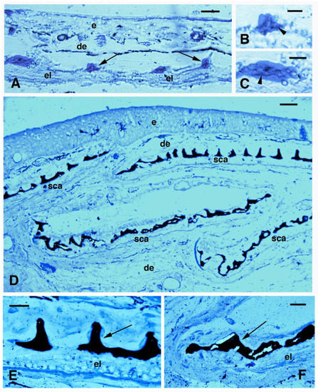 Von Kossa staining for calcium deposition (black) in 5 cm long specimen (A–C) and juveniles (D–F). Von Kossa stain (dark) and wekly methylene blue stain. (A) Formation of denticles of squamulin (arrows) on a thin scale. Bar, 10 μm. (B) Close up of a pointed denticle with initial calcification (dark, arrowhead). Bar, 5 μm; (C) Larger denticle with initial calcification (arrowhead). Bar, 5 μm. (D) low magnification and panoramic view of a longitudinal section showing four calcified scales in their squamulin (denticles) layer. Bar, 20 μm. (E) Close up of a calcified scale (arrow on denticles). Bar, 10 μm. (F) detail on the marginal area of a scale with calcified denticles (arrow). Bar, 10 μm. Legends: de, dermis; e, epidermis; el, elasmodin; sca, scales.
