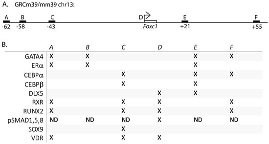 Transcription factors regulating Foxc1. (A) Schematic of enhancers near Foxc1. (B) “X” indicates the presence of the transcription factor at the indicated enhancer or promoter by ChIP-sequencing and/or ChIP-qPCR. ND = not determined.