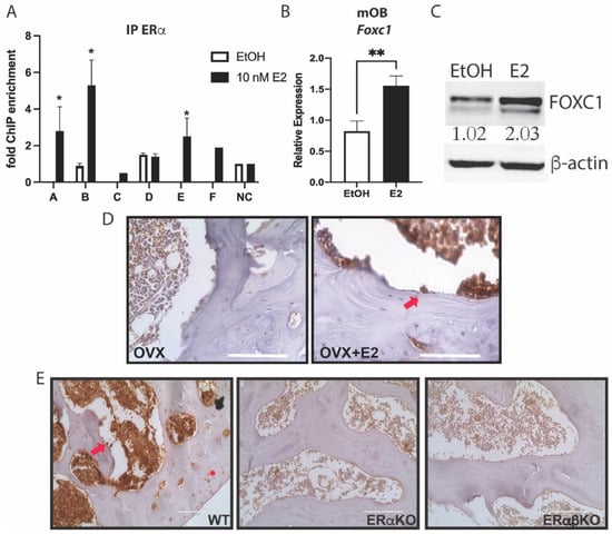 ERα regulates Foxc1. (A) Primary calvarial osteoblasts were treated with ethanol (EtOH) as a vehicle control or 10 nM E2 for 45 min before being fixed with 4% PFA. ChIP was performed with an antibody to ERα. qPCR was performed at the indicated regions near Foxc1 or a negative control (NC) region. (B) Primary calvarial osteoblasts were treated with EtOH or 10 nM E2 for 24 h. RNA was obtained, and qPCR was performed with primers for Foxc1 and normalized to Actb mRNA. (C) Primary calvarial osteoblasts were treated with 10 nM E2 for 24 h. Protein was obtained, and immunoblotting was performed with antibodies to FOXC1 and β-actin. The bands were quantified and normalized to β-actin and are displayed under the FOXC1 band. (D) Immunohistochemistry was performed with an antibody to FOXC1 (brown) on femurs from ovariectomized mice treated with or without 50 mg/kg body weight of E2 for 24 h. The slides were co-stained with hematoxylin. The arrow indicates an example of a FOXC1+ osteoblast. Bar = 100 μm. (E) Immunohistochemistry was performed with an antibody to FOXC1 (brown) on femurs from wild-type, ERαKO, and ERαβKO mice and co-stained with hematoxylin. The arrow indicates an example of a FOXC1+ osteoblast. * indicates an example of a FOXC1+ chondrocyte. Bar = 100 μm. * = p value < 0.05, ** = p value < 0.01.
