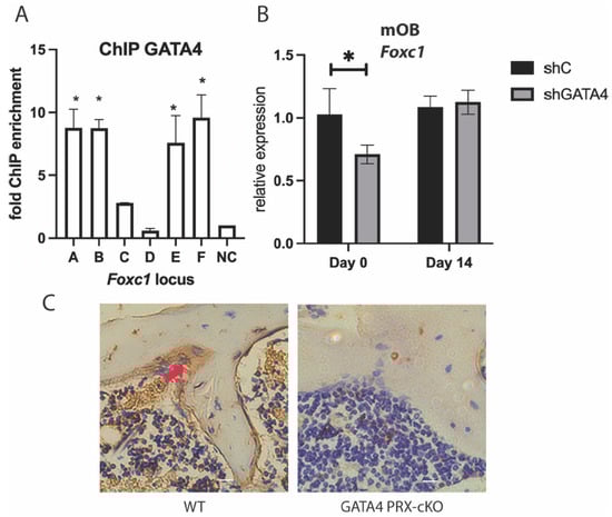 FOXC1 is critical to bone development as it controls endochondral and intramembranous ossification [,,,]. Loss-of-function of FOXC1 in mice and humans leads to developmental abnormalities in the appendicular and axial skeletons. Mechanistically, FOXC1 has been shown to regulate Runx2 [], β-catenin [,], and Msx2 [], all important regulators of skeletogenesis. In osteoblasts, FOXC1 binds to the Runx2 promoter and activates the expression of Runx2 in response to intermittent parathyroid hormone in MC3T3-E1 cells []. FOX proteins can function as either classical transcription factors, pioneer factors, or cofactors []. We show that FOXC1 interacts with GATA4 and upregulates Runx2 by binding to an enhancer and its promoters in mouse osteoblasts. FOXC1 also binds to the DKK1 promoter to suppress expression [], while GATA4 is also recruited to the DKK1 promoter and enhancer to activate WNT signaling in osteoblasts []. Moreover, we find that 79.8% of the GATA4 binding sites contained the motif MA0481.1, a forkhead recognition site. This suggests a coregulation pattern between FOXC1 and GATA4 in osteoblasts. Other osteogenic markers such as Osx, Alp, and Bglap (osteocalcin) are upregulated by FOXC1 [,]. Thus, ChIP-sequencing of FOXC1 would provide many additional gene targets in osteoblast differentiation. An analysis of histone modifications and the timing of FOXC1 and GATA4 binding would help determine if they are pioneer factors.