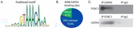 Analysis of our GATA4 ChIP-seq data [] using Analysis of Enriched Motifs (AME) [] software revealed that the most highly enriched motif (p value < 3.95 × 10−100) in the 5983 identified GATA4 binding sites is a canonical forkhead motif. Simple Enrichment Analysis (SEA) [] also identified a forkhead motif (MA0481.1, p value < 3.15 × 10−15, Figure 4A). 79.8% of the GATA4 binding sites contained the motif MA0481.1 (Figure 4B), suggesting that FOXC1 binds with or near GATA4 to regulate osteoblast-specific genes. Because the GATA4 ChIP-seq data predicts a forkhead protein/FOXC1 at the same binding sites, we sought to determine if GATA4 and FOXC1 physically interact through direct or indirect protein–protein interactions. Co-immunoprecipitations were performed with an antibody to GATA4, FOXC1, or normal IgG and demonstrated that GATA4 and FOXC1 interact in calvarial osteoblasts (Figure 4C).