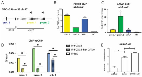 We have previously shown that GATA4 binds to both promoters of Runx2 and to a downstream enhancer (Figure 5A) to regulate its expression and osteoblast differentiation []. In primary osteoblast cells, FOXC1 and GATA4 are recruited to these genomic regions, as detected by ChIP on the Runx2 enhancer 1 and on both promoters 1 and 2 (Figure 5B,C). ChIP-reChIP showed that FOXC1 and GATA4 are at the Runx2 promoters and an enhancer at the same time (Figure 5D). In addition, GATA4 enhances the transcription of a Runx2-luciferase plasmid containing the osteoblast-specific P1 promoter [], and the addition of FOXC1 enhances this transcriptional regulation (p < 0.01) (Figure 5E). These results support the notion that FOXC1 is directly enhancing GATA4 activation of Runx2 expression.