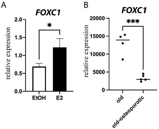 FOXC1 in human cells. (A) Primary human osteoblasts were treated with vehicle control (Ethanol, EtOH) or 10 nM E2 for 24 h. RNA was obtained, and qPCR was performed for FOXC1 and normalized to ACTB. (B) GEO dataset GSE35959 was analyzed for the expression of FOXC1 in age-matched elderly individuals with or without osteoporosis. * = p value < 0.05; *** = p value < 0.001.