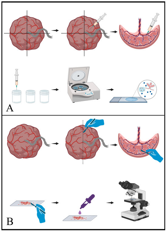 Schematic representation of cytology sampling techniques. (A) shows the procedure for fine-needle aspiration (FNA). In the upper sequence, a freshly delivered placenta is arbitrarily divided into quadrants and a sampling needle is passed through the foetal surface (chorionic plate) into the parenchyma. Negative pressure applied from the syringe draws fragments of the parenchyma into the needle and syringe. In the lower sequence, the material from the syringe and needle is transferred into vials of either CytoLyt or normal saline. This material is then centrifuged and processed to generate the final slides, which contain a mixture of parenchymal elements. (B) shows the equivalent process for scrape samples. As seen in the upper sequence, a fresh placenta is sliced to reveal the cut surface of the placental parenchyma. A scalpel blade is then scraped along the cut surface and collects fragments of the parenchyma. In the lower sequence, the material present on the scalpel blade is transferred to a slide and then stained for microscopic interpretation. [Schematics created with BioRender.com (accessed on 7 December 2023)].