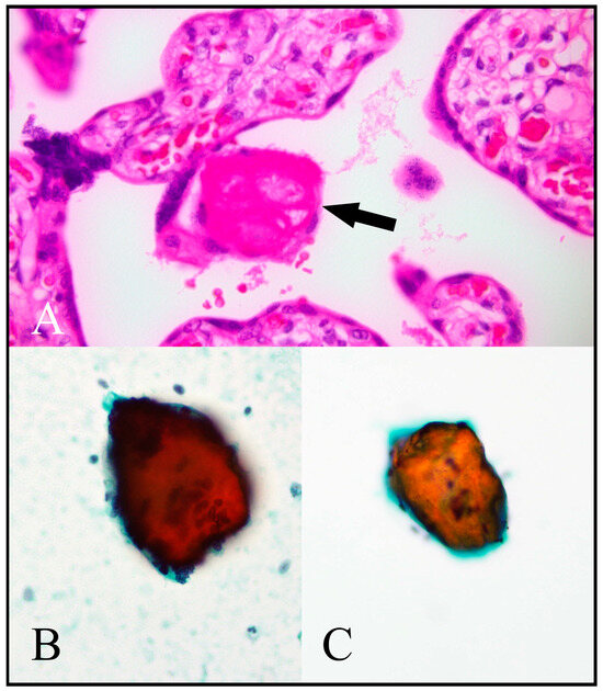 Fibrinoid. (A) A standard haematoxylin and eosin (H/E)-stained placental histological section shows a deposit of fibrinoid material (arrow). (B,C) show fibrinoid material in Papanicolaou-stained cytology preparations represented by orangeophilic crystalline fragments. [(A) H/E, 400×; (B) Papanicolaou cytospin, 400×; (C) Papanicolaou ThinPrep, 400×.].