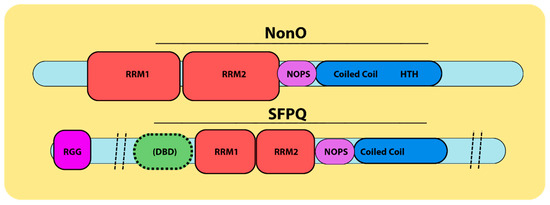 DBHS family nomenclature. NonO has also been termed the 54 kDa Nuclear RNA-Binding Protein (p54nrb) and the 55 kDa Nuclear Matrix Protein (nmt55). SFPQ was originally named the PTB-associated splicing factor (PSF). NonO and SFPQ are two members of the DBHS family. The DBHS conserved regions contain two RNA recognition motifs (RRMs, in red), a NONA/ParaSpeckle (NOPS) domain (in purple) and a coiled coil region (in blue). SFPQ also contains an N-terminal Arginine Glycine (RGG) region (in pink) and an uncharacterized DNA-binding domain (DBD, in green) at the N-terminus of its DBHS region. NonO has a highly charged helix–turn–helix (HTH in blue) C-terminal to its DBHS region, which has been suggested to have DNA-binding activity [19,20,21,22,24].
