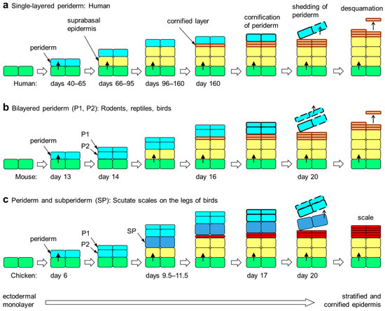 Embryonic development of the epidermis in amniotes. The periderm is a transient layer of epithelial cells covering the epidermis during its initial stratification in the embryo. Upon formation of the cornified layer of the epidermis, peridermal cells also undergo cornification. Subsequently, the periderm is shed from the surface. The periderm is either single-layered (a), two-layered (b) or multi-layered (not shown). Developing scutate scales of birds are covered by a subperiderm in addition to the bilayered periderm (c) [51,58]. The timing (days of embryonic development) of epithelial stratification events in selected species [5,44,51,59] is shown in each panel. Colors indicate the differentiation states of epithelial cells: green, basal layer keratinocytes; yellow suprabasal keratinocytes; orange, cornified keratinocytes of the stratum corneum; red, cornified keratinocytes of cornified scales; light blue, periderm; dark blue, subperiderm.
