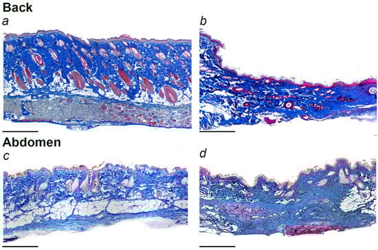 The skin of the back and abdomen of the rat before surgery and the site of the skin wound 30 days after surgery. (a)—back skin before surgery, (b)—site of the skin wound on the back 30 days after surgery, (c)—abdominal skin before surgery, (d)—site of the skin wound on the abdomen 30 days after surgery. Scale section 500 µm. Mallory staining.