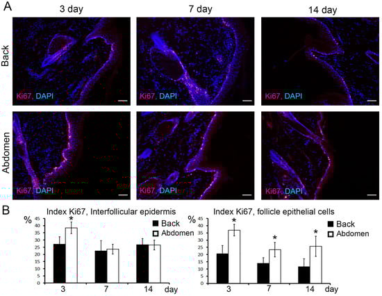 Immunohistochemical study of proliferative activity. (A) Detection of Ki67 proliferation marker in keratinocytes of intrafollicular epidermis and epitheliocytes of hair follicle in back and abdomen skin (red glow), nuclei stained with DAPI (blue glow), scale bar—50 μm. (B) Ki67 index in % in keratinocytes of intrafollicular epidermis and hair follicle epitheliocytes in back and abdominal skin. Standard deviation was used as error bars, *—statistically significant differences compared to the corresponding index at the given term in the back skin (p < 0.05).