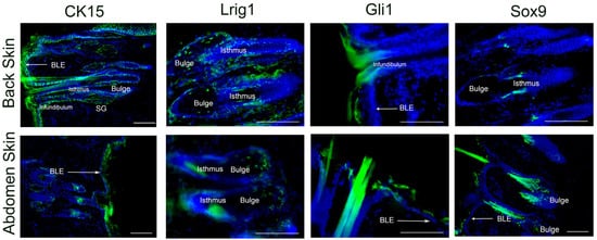 Immunohistochemical staining of intact skin of the back and abdomen with antibodies to skin stem cells markers: CK15-cytokeratin15, Lrig1, Gli1, Sox9 (green glow). Cell nuclei are stained in blue (DAPI dye), specific marker in green. The scale marker is 100 μm, SG—sebaceous gland, BLE—basal layer of the epidermis.