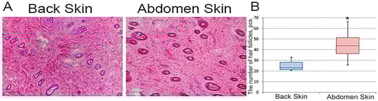 Longitudinal skin sections stained with hematoxylin and eosin, scale bar 100 μm (A). Number of hairs on the skin of the back and abdomen per square mm, * denotes statistically significant differences between groups, p < 0.001 (B).