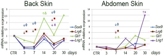 The expression levels of skin stem cell marker genes Sox9, Gli 1, Lgr6, and Lrig1 were evaluated using qPCR. In intact skin, the expression level of all genes under study was statistically significantly higher in the abdominal region (p < 0.050) (Table 3). After skin excision, the dynamics of expression of the studied genes was as follows. In the abdomen region, the dynamics of Sox9 and Lgr6 gene expression coincide: expression decreased at 3, 7, and 20 days after surgery; at the other terms, the changes were insignificant (Figure 5). Gli1 gene expression increases by the 20th day after surgery and remains at the level of intact skin during the rest periods. Lrig1 gene expression decreases by 20 days after surgery and remains at the level of intact skin during the rest of the period. In the dorsal skin, Sox9 gene expression slightly decreases on the 7th day after surgery. The expression of Lgr6 and Gli1 genes decreases by 7 days and remains at the level of intact skin during the rest periods. Lrig1 gene expression increases (11-fold) by the 30th day and remains at the level of intact skin during the rest of the period.